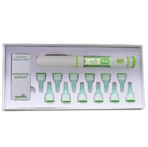 The Synedica Retatrutide® 40mg Injection Pen Kit contains 1 pen, 12 disposable needles and an instruction booklet.